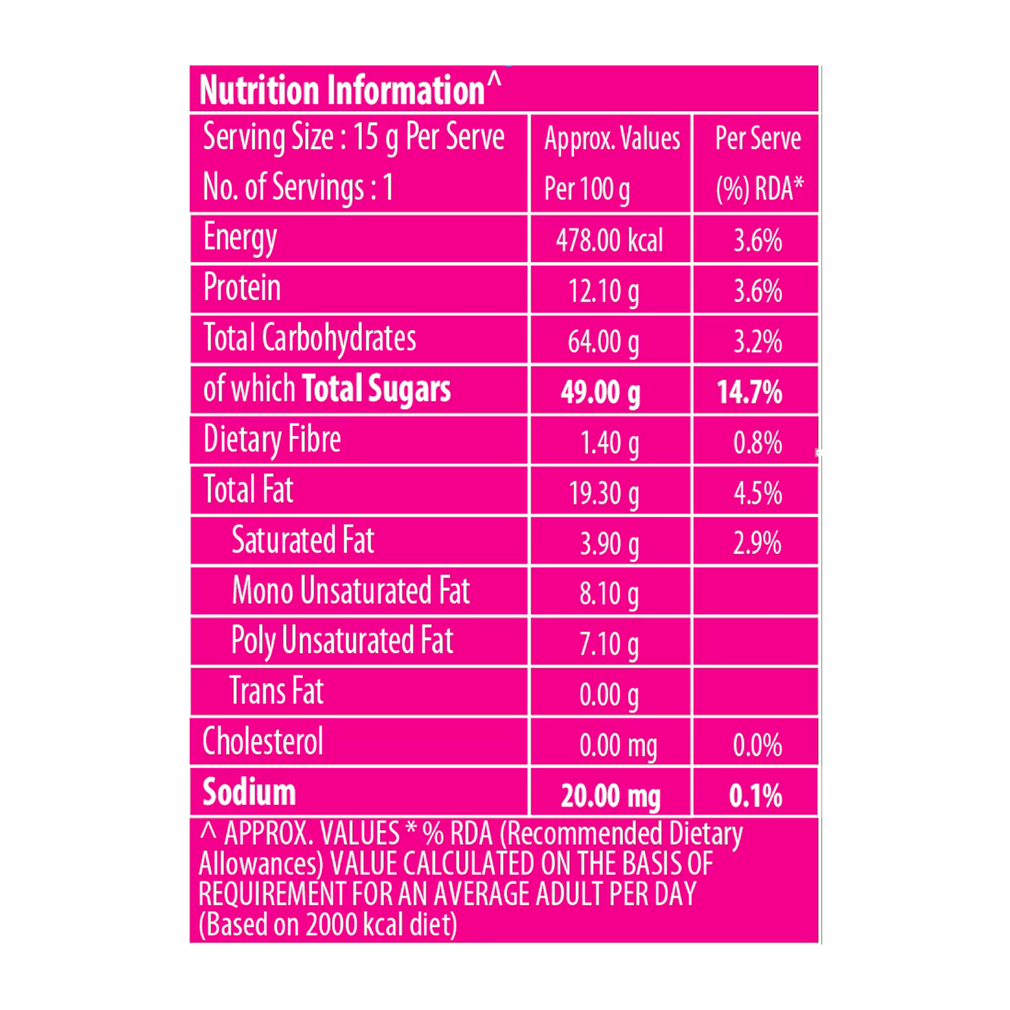 | Serving Size: 15 g Per Serve No. of Servings: 1 | Approx. Values per 100 g | Per Serve (%) RDA^^ |