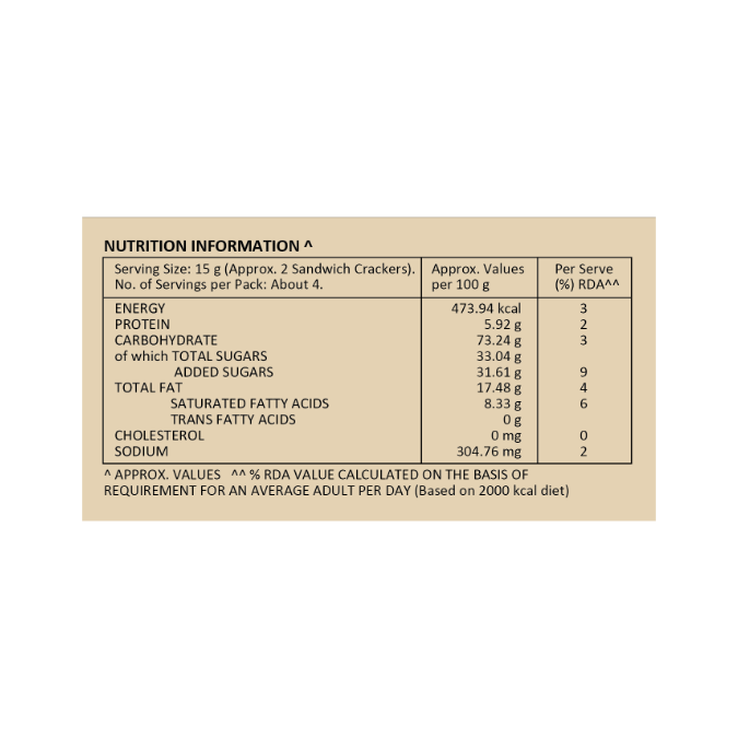 | Serving Size: 15 g (2 Sandwich Crackers) No. of Servings per Pack: About 2 | Approx. Values per 100 g | Per Serve (%) RDA^^ |